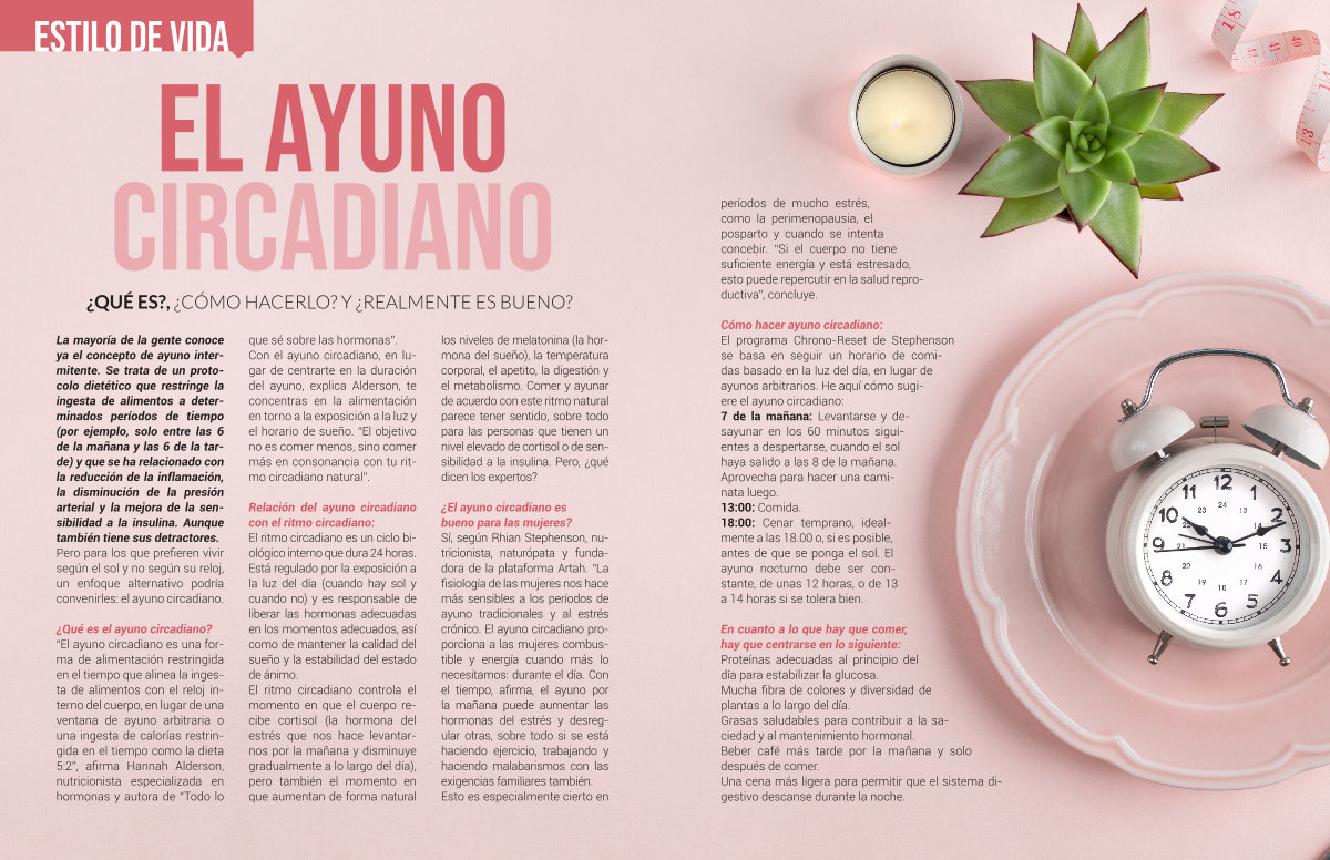 ¿ El ayuno circadiano es bueno para las mujeres? Sí, según Rhian Stephenson, nutricionista, naturópata y fundadora de la plataforma Artah.“ La fisiología de las mujeres nos hace más sensibles a los períodos de ayuno tradicionales y al estrés crónico. El ayuno circadiano proporciona a las mujeres combustible y energía cuando más lo necesitamos: durante el día. Con el tiempo, afirma, el ayuno por la mañana puede aumentar las hormonas del estrés y desregular otras, sobre todo si se está haciendo ejercicio, trabajando y haciendo malabarismos con las exigencias familiares también. Esto es especialmente cierto en