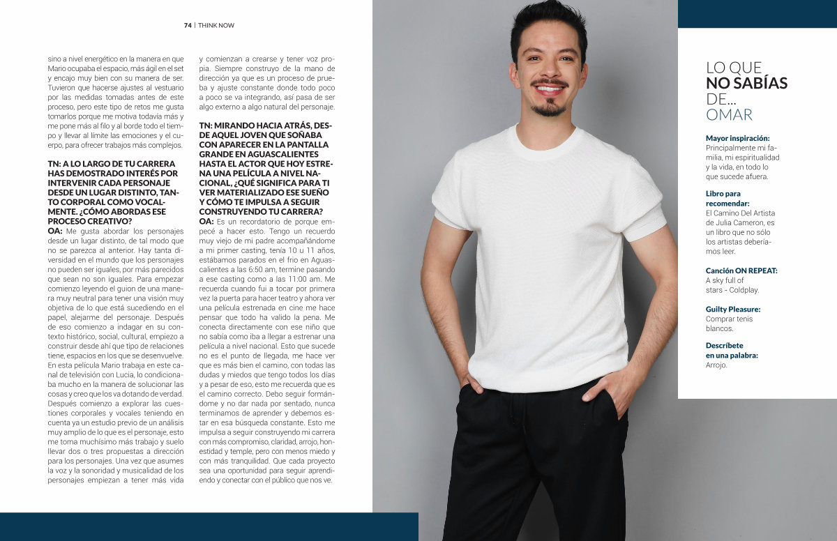 TN: MIRANDO HACIA ATRÁS, DES- DE AQUEL JOVEN QUE SOÑABA CON APARECER EN LA PANTALLA GRANDE EN AGUASCALIENTES HASTA EL ACTOR QUE HOY ESTRE- NA UNA PELÍCULA A NIVEL NA- CIONAL, ¿ QUÉ SIGNIFICA PARA TI VER MATERIALIZADO ESE SUEÑO Y CÓMO TE IMPULSA A SEGUIR CONSTRUYENDO TU CARRERA? OA: Es un recordatorio de porque empecé a hacer esto. Tengo un recuerdo muy viejo de mi padre acompañándome a mi primer casting, tenía 10 u 11 años, estábamos parados en el frio en Aguascalientes a las 6:50 am, termine pasando a ese casting como a las 11:00 am. Me recuerda cuando fui a tocar por primera vez la puerta para hacer teatro y ahora ver una película estrenada en cine me hace pensar que todo ha valido la pena. Me conecta directamente con ese niño que no sabía como iba a llegar a estrenar una película a nivel nacional. Esto que sucede no es el punto de llegada, me hace ver que es más bien el camino, con todas las dudas y miedos que tengo todos los días y a pesar de eso, esto me recuerda que es el camino correcto. Debo seguir formándome y no dar nada por sentado, nunca terminamos de aprender y debemos estar en esa búsqueda constante. Esto me impulsa a seguir construyendo mi carrera con más compromiso, claridad, arrojo, honestidad y temple, pero con menos miedo y con más tranquilidad. Que cada proyecto sea una oportunidad para seguir aprendiendo y conectar con el público que nos ve.