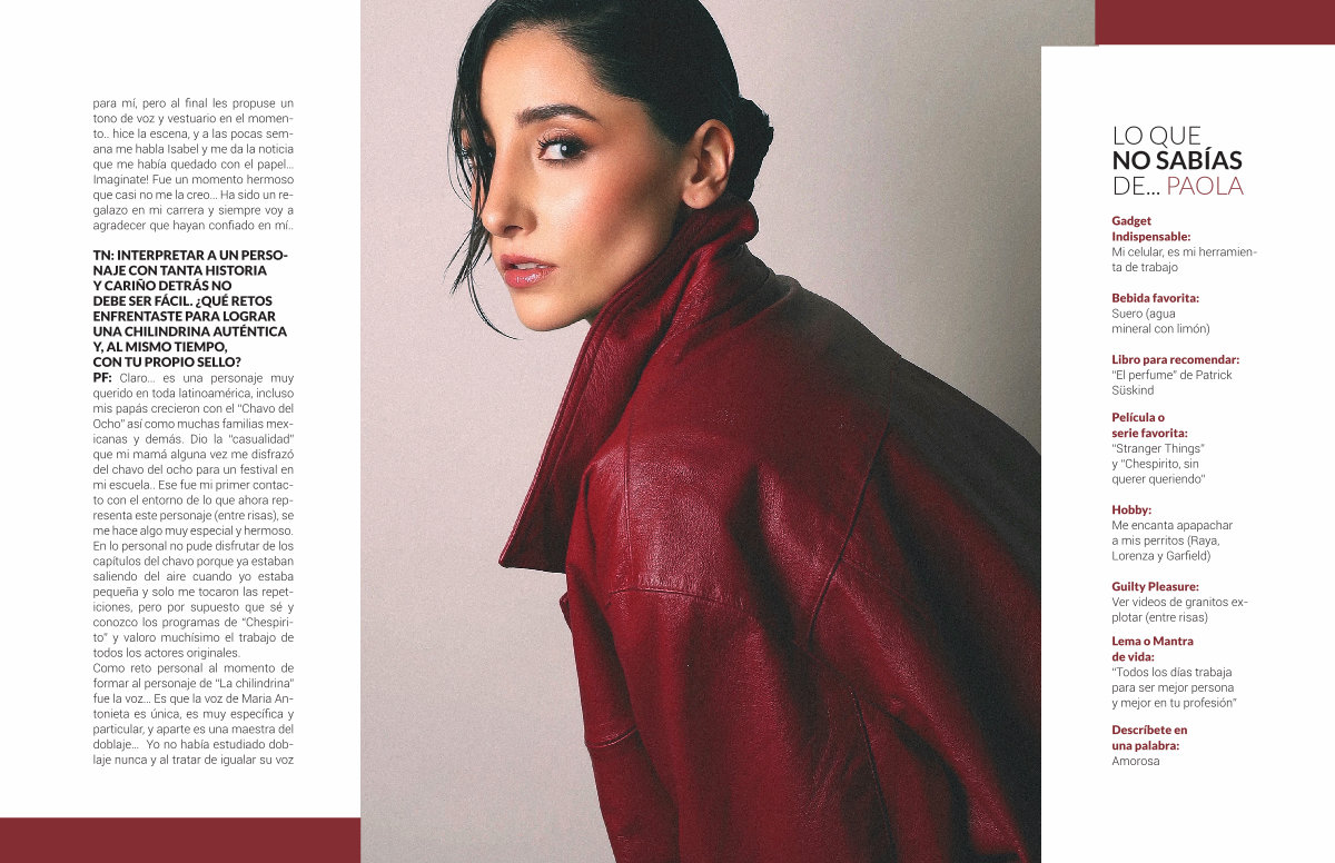 TN: INTERPRETAR A UN PERSO- NAJE CON TANTA HISTORIA Y CARIÑO DETRÁS NO DEBE SER FÁCIL. ¿ QUÉ RETOS ENFRENTASTE PARA LOGRAR UNA CHILINDRINA AUTÉNTICA Y, AL MISMO TIEMPO, CON TU PROPIO SELLO? PF: Claro … es una personaje muy querido en toda latinoamérica, incluso mis papás crecieron con el“ Chavo del Ocho” así como muchas familias mexicanas y demás. Dio la“ casualidad” que mi mamá alguna vez me disfrazó del chavo del ocho para un festival en mi escuela.. Ese fue mi primer contacto con el entorno de lo que ahora representa este personaje( entre risas), se me hace algo muy especial y hermoso. En lo personal no pude disfrutar de los capítulos del chavo porque ya estaban saliendo del aire cuando yo estaba pequeña y solo me tocaron las repeticiones, pero por supuesto que sé y conozco los programas de“ Chespirito” y valoro muchísimo el trabajo de todos los actores originales. Como reto personal al momento de formar al personaje de“ La chilindrina” fue la voz … Es que la voz de Maria Antonieta es única, es muy específica y particular, y aparte es una maestra del doblaje … Yo no había estudiado doblaje nunca y al tratar de igualar su voz
