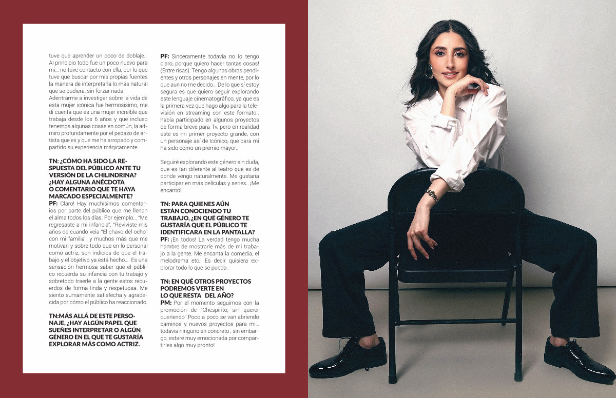 TN: ¿ CÓMO HA SIDO LA RE- SPUESTA DEL PÚBLICO ANTE TU VERSIÓN DE LA CHILINDRINA? ¿ HAY ALGUNA ANÉCDOTA O COMENTARIO QUE TE HAYA MARCADO ESPECIALMENTE? PF: Claro! Hay muchísimos comentarios por parte del público que me llenan el alma todos los días. Por ejemplo …“ Me regresaste a mi infancia”,“ Reviviste mis años de cuando veia“ El chavo del ocho” con mi familia”, y muchos más que me motivan y sobre todo que en lo personal como actriz, son indicios de que el trabajo y el objetivo ya está hecho … Es una sensación hermosa saber que el público recuerda su infancia con tu trabajo y sobretodo traerle a la gente estos recuerdos de forma linda y respetuosa. Me siento sumamente satisfecha y agradecida por cómo el público ha reaccionado.