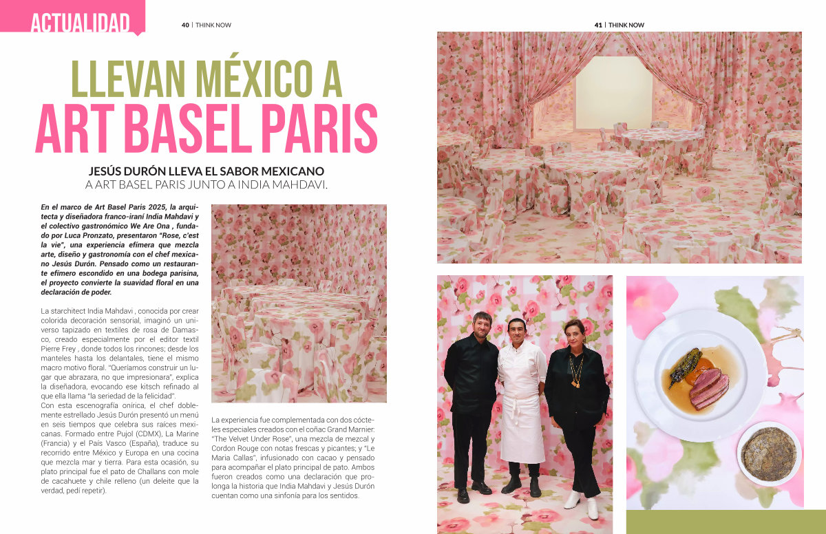 En el marco de Art Basel Paris 2025, la arquitecta y diseñadora franco-iraní India Mahdavi y el colectivo gastronómico We Are Ona, fundado por Luca Pronzato, presentaron“ Rose, c’ est la vie”, una experiencia efímera que mezcla arte, diseño y gastronomía con el chef mexicano Jesús Durón. Pensado como un restaurante efímero escondido en una bodega parisina, el proyecto convierte la suavidad floral en una declaración de poder.