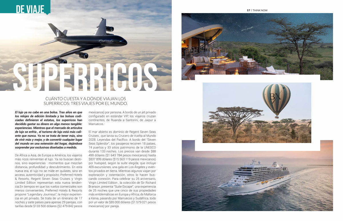 De África a Asia, de Europa a América, los viajeros más ricos reinventan el lujo. Ya no buscan destinos, sino experiencias: momentos que mezclan distancia, profundidad y descubrimiento. En esta nueva era, el lujo no se mide en quilates, sino en acceso, autenticidad y propósito; Preferred Hotels & Resorts, Regent Seven Seas Cruises y Virgin Limited Edition representan esta nueva tendencia. En tiempos en que los vuelos comerciales son menos convenientes, Preferred Hotels & Resorts propone“ Legendary Journeys”, la mejor experiencia en jet privado. Se trata de un itinerario de 17 noches y siete países para apenas 29 parejas, con tarifas desde $ 133 500 dólares($ 2 479 842 pesos mexicanos) por persona. A bordo de un jet privado configurado en estándar VIP, los viajeros cruzan continentes, de Ruanda a Santorini, de Jaipur a Marruecos.