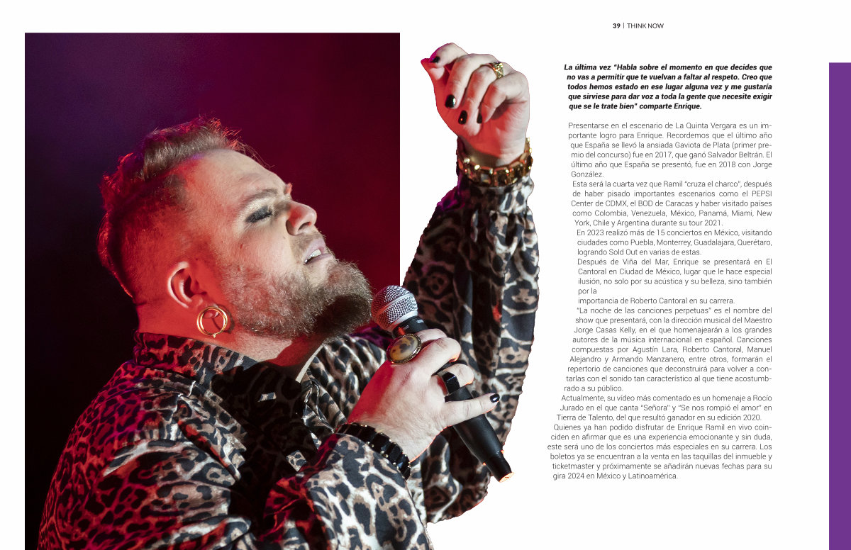 Presentarse en el escenario de La Quinta Vergara es un importante logro para Enrique. Recordemos que el último año que España se llevó la ansiada Gaviota de Plata( primer premio del concurso) fue en 2017, que ganó Salvador Beltrán. El último año que España se presentó, fue en 2018 con Jorge González. Esta será la cuarta vez que Ramil“ cruza el charco”, después de haber pisado importantes escenarios como el PEPSI Center de CDMX, el BOD de Caracas y haber visitado países como Colombia, Venezuela, México, Panamá, Miami, New York, Chile y Argentina durante su tour 2021. En 2023 realizó más de 15 conciertos en México, visitando ciudades como Puebla, Monterrey, Guadalajara, Querétaro, logrando Sold Out en varias de estas. Después de Viña del Mar, Enrique se presentará en El Cantoral en Ciudad de México, lugar que le hace especial ilusión, no solo por su acústica y su belleza, sino también por la importancia de Roberto Cantoral en su carrera.“ La noche de las canciones perpetuas” es el nombre del show que presentará, con la dirección musical del Maestro Jorge Casas Kelly, en el que homenajearán a los grandes autores de la música internacional en español. Canciones compuestas por Agustín Lara, Roberto Cantoral, Manuel Alejandro y Armando Manzanero, entre otros, formarán el repertorio de canciones que deconstruirá para volver a contarlas con el sonido tan característico al que tiene acostumbrado a su público. Actualmente, su vídeo más comentado es un homenaje a Rocío Jurado en el que canta“ Señora” y“ Se nos rompió el amor” en Tierra de Talento, del que resultó ganador en su edición 2020. Quienes ya han podido disfrutar de Enrique Ramil en vivo coinciden en afirmar que es una experiencia emocionante y sin duda, este será uno de los conciertos más especiales en su carrera. Los boletos ya se encuentran a la venta en las taquillas del inmueble y ticketmaster y próximamente se añadirán nuevas fechas para su gira 2024 en México y Latinoamérica.