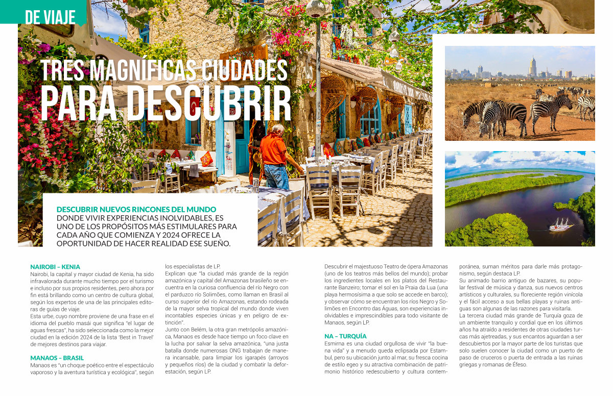 NAIROBI – KENIA Nairobi, la capital y mayor ciudad de Kenia, ha sido infravalorada durante mucho tiempo por el turismo e incluso por sus propios residentes, pero ahora por fin está brillando como un centro de cultura global, según los expertos de una de las principales editoras de guías de viaje. Esta urbe, cuyo nombre proviene de una frase en el idioma del pueblo masái que significa“ el lugar de aguas frescas”, ha sido seleccionada como la mejor ciudad en la edición 2024 de la lista‘ Best in Travel’ de mejores destinos para viajar.
