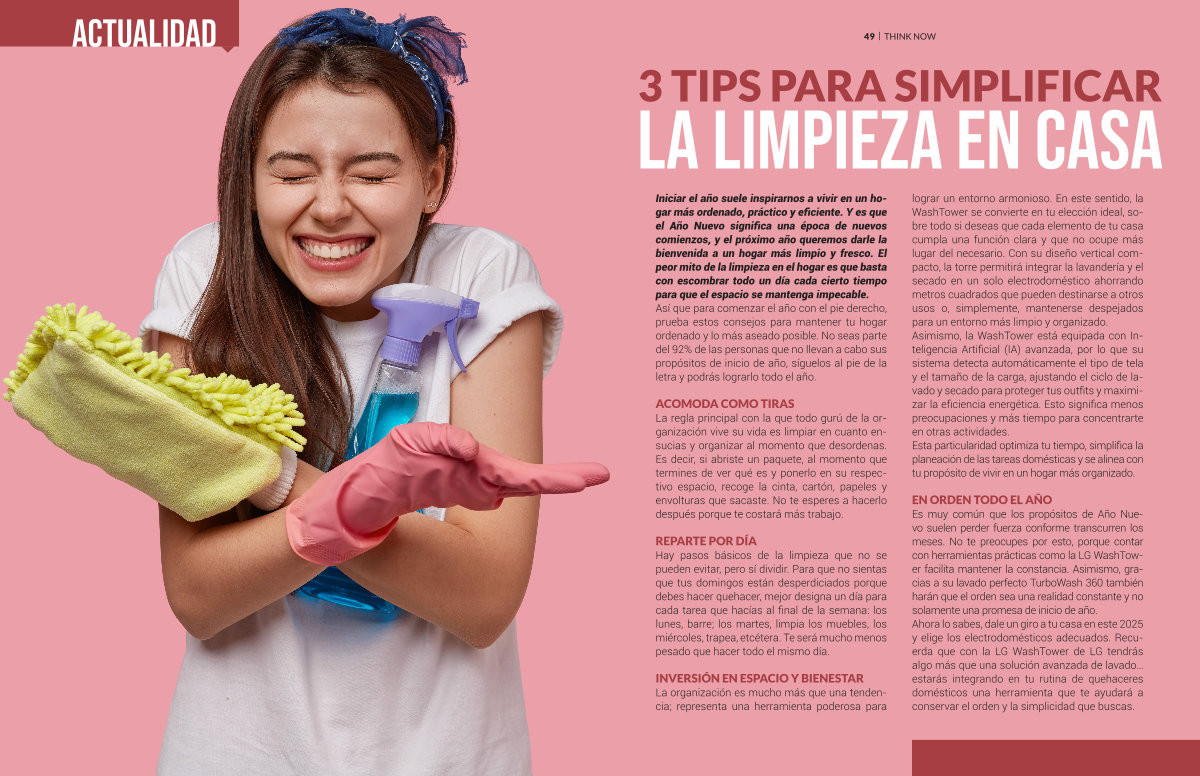 EN ORDEN TODO EL AÑO Es muy común que los propósitos de Año Nuevo suelen perder fuerza conforme transcurren los meses. No te preocupes por esto, porque contar con herramientas prácticas como la LG WashTower facilita mantener la constancia. Asimismo, gracias a su lavado perfecto TurboWash 360 también harán que el orden sea una realidad constante y no solamente una promesa de inicio de año. Ahora lo sabes, dale un giro a tu casa en este 2025 y elige los electrodomésticos adecuados. Recuerda que con la LG WashTower de LG tendrás algo más que una solución avanzada de lavado … estarás integrando en tu rutina de quehaceres domésticos una herramienta que te ayudará a conservar el orden y la simplicidad que buscas.