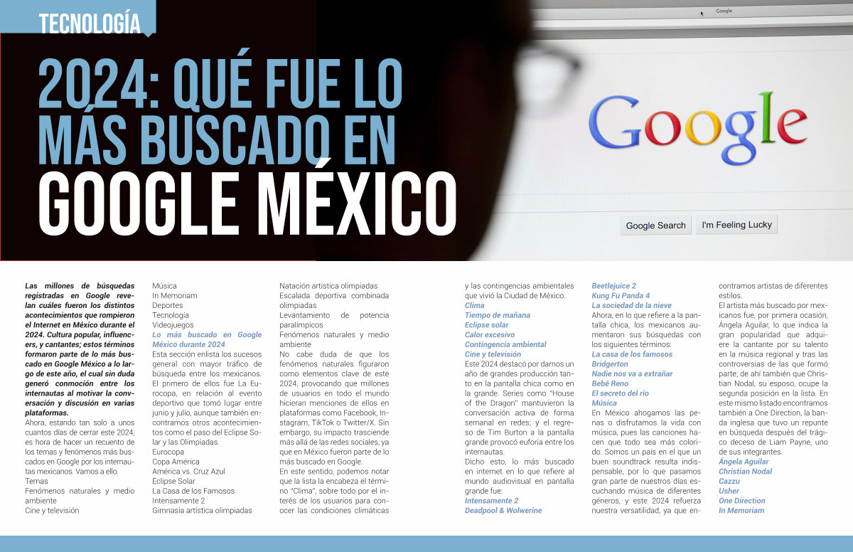 Las millones de búsquedas registradas en Google revelan cuáles fueron los distintos acontecimientos que rompieron el Internet en México durante el 2024. Cultura popular, influencers, y cantantes; estos términos formaron parte de lo más buscado en Google México a lo largo de este año, el cual sin duda generó conmoción entre los internautas al motivar la conversación y discusión en varias plataformas. Ahora, estando tan solo a unos cuantos días de cerrar este 2024, es hora de hacer un recuento de los temas y fenómenos más buscados en Google por los internautas mexicanos. Vamos a ello. Temas Fenómenos naturales y medio ambiente Cine y televisión