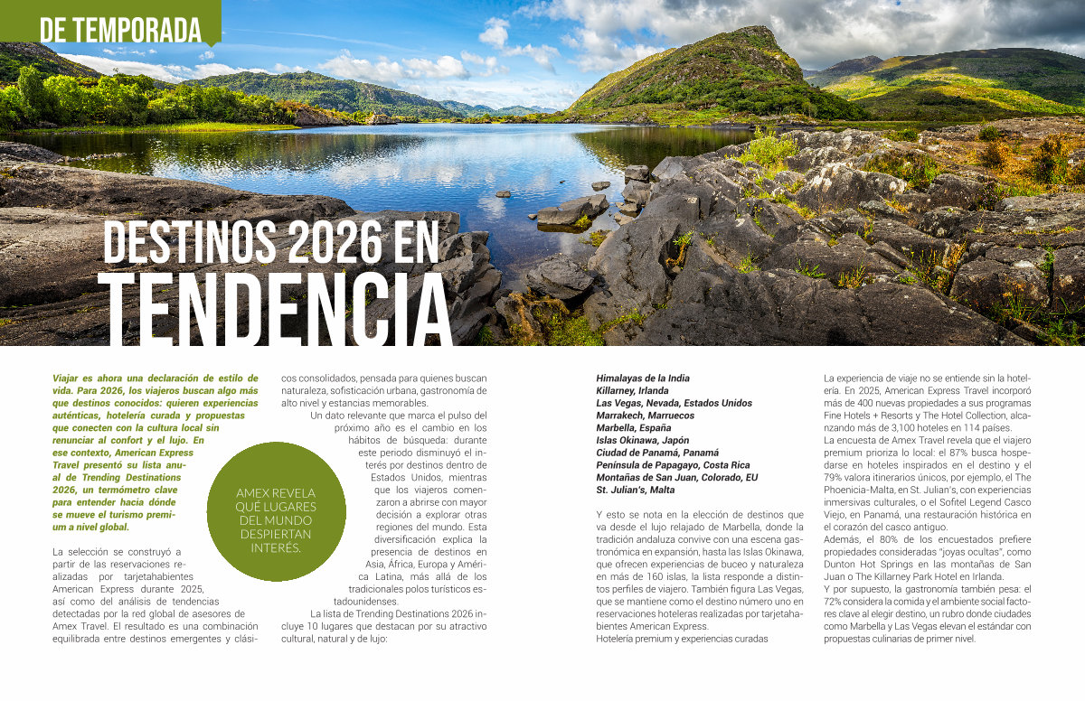 La selección se construyó a partir de las reservaciones realizadas por tarjetahabientes American Express durante 2025, así como del análisis de tendencias detectadas por la red global de asesores de Amex Travel. El resultado es una combinación equilibrada entre destinos emergentes y clásicos consolidados, pensada para quienes buscan naturaleza, sofisticación urbana, gastronomía de alto nivel y estancias memorables.