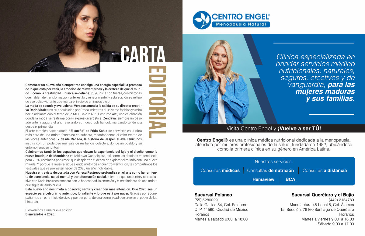Comenzar un nuevo año siempre trae consigo una energía especial: la promesa de lo que está por venir, la emoción de reinventarnos y la certeza de que el mundo— como la creatividad— nunca se detiene. 2026 inicia con fuerza, con historias que hablan de transformación, arte, estilo y renacimiento, y esta edición es reflejo de ese pulso vibrante que marca el inicio de un nuevo ciclo. La moda se sacude y evoluciona: Versace anuncia la salida de su director creativo Dario Vitale tras su adquisición por Prada, mientras el universo fashion ya mira hacia adelante con el tema de la MET Gala 2026:“ Costume Art”, una celebración donde la moda se reafirma como expresión artística. Zendaya, siempre un paso adelante, inaugura el año revelando su nuevo bob haircut, marcando tendencia desde el primer día. El arte también hace historia:“ El sueño” de Frida Kahlo se convierte en la obra más cara de una artista femenina en subasta, recordándonos el valor eterno de las voces auténticas. Y desde Canadá, la historia de Jasper, el ave Fénix, nos inspira con un poderoso mensaje de resiliencia colectiva, donde un pueblo y su entorno renacen juntos. Celebramos también los espacios que elevan la experiencia del lujo y el diseño, como la nueva boutique de Montblanc en Midtown Guadalajara, así como los destinos en tendencia para 2026, revelados por Amex, que despiertan el deseo de explorar el mundo con una nueva mirada. Y porque la música sigue siendo motor de encuentro y emoción, te compartimos los festivales que ya prometen hacer de 2026 un año inolvidable. Nuestra entrevista de portada con Vanesa Restrepo profundiza en el arte como herramienta de conciencia, salud mental y transformación social, mientras que una entrevista exclusiva con Karla Breu nos conecta con la honestidad, la emoción y el crecimiento de una artista que sigue dejando huella. Este nuevo año nos invita a observar, sentir y crear con más intención. Que 2026 sea un espacio para celebrar lo auténtico, lo valiente y lo que está por nacer. Gracias por acompañarnos en este inicio de ciclo y por ser parte de una comunidad que cree en el poder de las historias.