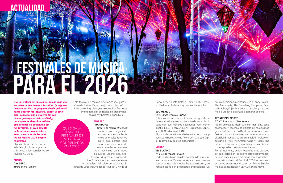 TECATE PA’ L NORTE 27 al 29 de marzo | Monterrey No es arriesgado decir que, con tres días, ocho escenarios y decenas de artistas de muchísimos géneros distintos, el Pa’ l Norte ya se convirtió en el festival más ambicioso del país por su masividad y diversidad musical. La próxima edición incluye en su cartel a Tyler, The Creator, Guns N’ Roses, The Killers, The Lumineers, y muchísimos más. Córrele, todavía puedes comprar tus entradas. Por el momento, de los festivales más grandes del país, estos son los que ya están confirmados, pero no dudes que en próximas semanas sabremos más sobre si el Pitchfork 2026 se realizará, así como esperamos el cartel del Tecate Emblema que se realizará en CDMX el 16 de mayo.
