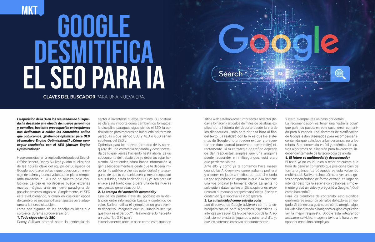 sitios web estaban acostumbrados a redactar( todavía lo hacen) artículos de miles de palabras explicando la historia del deporte desde la era de los dinosaurios … solo para dar esa hora al final del texto. La realidad con la IA es que los sistemas de Google ahora pueden extraer y presentar ese dato factual( contenido commodity) directamente. Si tu estrategia de tráfico depende de dar respuestas simples que una máquina puede responder en milisegundos, está claro que perderás visitas. Ante ello, y como ya te contamos hace meses, cuando las AI Overviews comenzaban a proliferar y a poner en jaque a medios de todo el mundo, un consejo básico es aportar lo que la IA no tiene: una voz original( y humana, claro). La gente no solo quiere datos; quiere análisis, opiniones, experiencias humanas y perspectivas únicas. Ese es el contenido que sobrevivirá y prosperará. 3. La autenticidad como estrella polar Los directivos de Google advierten contra la sobreoptimización para algoritmos específicos. Si intentas perseguir los trucos técnicos de la IA actual, siempre estarás jugando a ponerte al día, ya que los sistemas cambian constantemente.