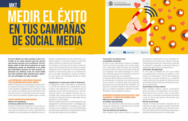 permanecen interactuando con tu contenido , especialmente en formatos como vídeos o historias . Una alta tasa de retención indica que el contenido es relevante y cautivador , lo que puede mejorar el rendimiento general de tus publicaciones . CTR ( Click Through Rate ) El CTR mide la cantidad de clics que reciben tus publicaciones o anuncios en relación con el número de impresiones . Un CTR alto refleja que tu llamado a la acción es efectivo y tu contenido capta la atención de la audiencia . Esta métrica es crucial para evaluar el éxito de campañas orientadas a conversiones . Social Share of Voice ( SSoV ) Este indicador analiza cuánta conversación genera tu marca en comparación con la competencia dentro de un sector . Tener un alto SSoV indica que tu estrategia está logrando destacar y que tu marca está siendo mencionada más frecuentemente . ROI de social media Calcular el retorno de inversión específico de tus esfuerzos en redes sociales te ayuda a determinar cuánto valor estás obteniendo por cada euro invertido . Esta métrica permite optimizar presupuestos y justificar futuras inversiones en social media .