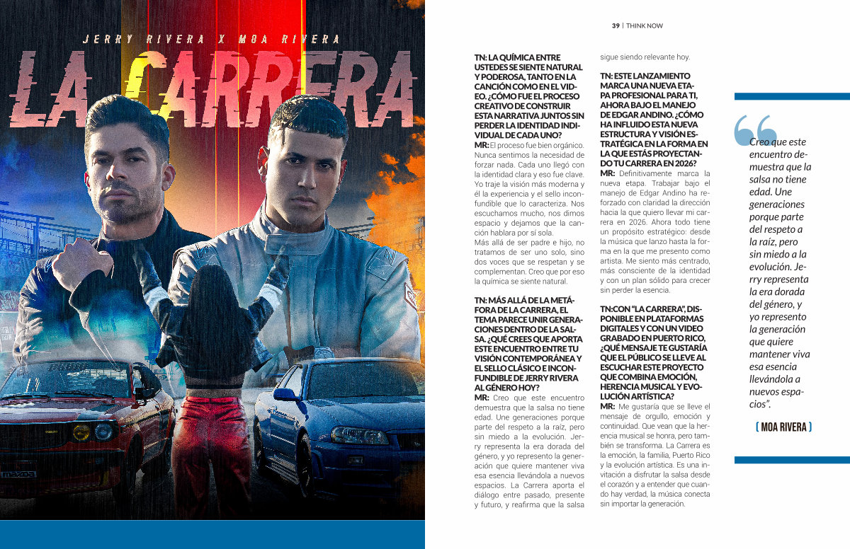 TN: MÁS ALLÁ DE LA METÁ- FORA DE LA CARRERA, EL TEMA PARECE UNIR GENERA- CIONES DENTRO DE LA SAL- SA. ¿ QUÉ CREES QUE APORTA ESTE ENCUENTRO ENTRE TU VISIÓN CONTEMPORÁNEA Y EL SELLO CLÁSICO E INCON- FUNDIBLE DE JERRY RIVERA AL GÉNERO HOY? MR: Creo que este encuentro demuestra que la salsa no tiene edad. Une generaciones porque parte del respeto a la raíz, pero sin miedo a la evolución. Jerry representa la era dorada del género, y yo represento la generación que quiere mantener viva esa esencia llevándola a nuevos espacios. La Carrera aporta el diálogo entre pasado, presente y futuro, y reafirma que la salsa sigue siendo relevante hoy.