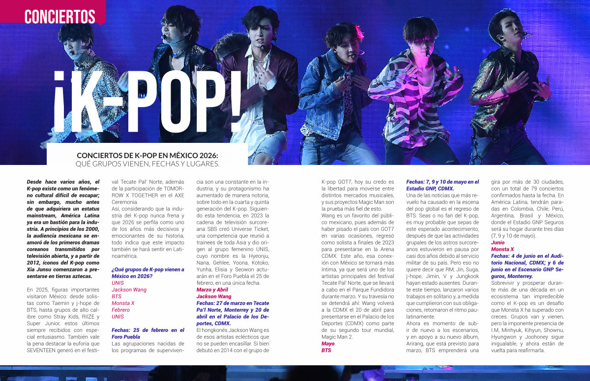 Fechas: 7, 9 y 10 de mayo en el Estadio GNP, CDMX. Una de las noticias que más revuelo ha causado en la escena del pop global es el regreso de BTS. Seas o no fan del K-pop, es muy probable que sepas de este esperado acontecimiento, después de que las actividades grupales de los astros surcoreanos estuvieron en pausa por casi dos años debido al servicio militar de su país. Pero eso no quiere decir que RM, Jin, Suga, j-hope, Jimin, V y Jungkook hayan estado ausentes. Durante este tiempo, lanzaron varios trabajos en solitario y, a medida que cumplieron con sus obligaciones, retomaron el ritmo paulatinamente. Ahora es momento de subir de nuevo a los escenarios, y en apoyo a su nuevo álbum, Arirang, que está previsto para marzo, BTS emprenderá una gira por más de 30 ciudades, con un total de 79 conciertos confirmados hasta la fecha. En América Latina, tendrán paradas en Colombia, Chile, Perú, Argentina, Brasil y México, donde el Estadio GNP Seguros será su hogar durante tres días( 7, 9 y 10 de mayo). Junio Monsta X Fechas: 4 de junio en el Auditorio Nacional, CDMX; y 6 de junio en el Escenario GNP Seguros, Monterrey. Sobrevivir y prosperar durante más de una década en un ecosistema tan impredecible como el K-pop es un desafío que Monsta X ha superado con creces. Grupos van y vienen, pero la imponente presencia de I. M, Minhyuk, Kihyun, Shownu, Hyungwon y Joohoney sigue inigualable, y ahora están de vuelta para reafirmarla.