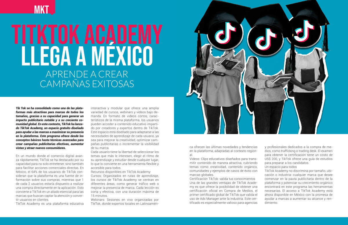 ca ofrecen las últimas novedades y tendencias en la plataforma, adaptadas al contexto regional. Videos: Clips educativos diseñados para transmitir contenido de manera atractiva, cubriendo temas como creatividad, contenido orgánico, comunidades y ejemplos de casos de éxito con marcas globales. Certificación TikTok: valida tus conocimientos Una de las grandes ventajas de TikTok Academy es que ofrece la posibilidad de obtener una certificación oficial en Compra de Medios, el primer certificado global de TikTok que valida el uso de Ads Manager ante la industria. Este certificado es especialmente valioso para agencias y profesionales dedicados a la compra de medios, como trafficking o trading desk. El examen para obtener la certificación tiene un costo de US $ 200, y TikTok ofrece una guía de estudios para preparar a los candidatos. Un espacio para todos TikTok Academy no discrimina por tamaño, ubicación o industria: cualquier marca que desee comenzar en la pauta publicitaria dentro de la plataforma y potenciar su crecimiento orgánico encontrará en este programa las herramientas necesarias. El acceso a TikTok Academy está ahora disponible en México con la promesa de ayudar a marcas a aumentar su alcance y rendimiento.