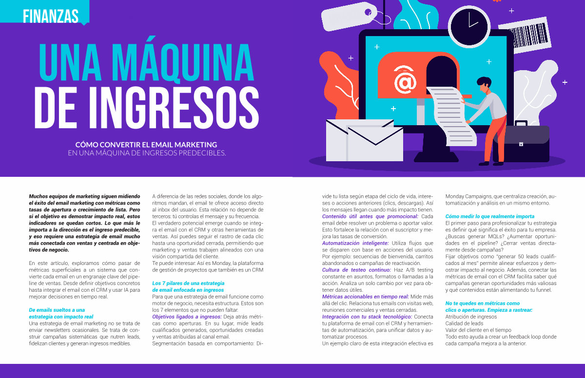 A diferencia de las redes sociales, donde los algoritmos mandan, el email te ofrece acceso directo al inbox del usuario. Esta relación no depende de terceros: tú controlas el mensaje y su frecuencia. El verdadero potencial emerge cuando se integra el email con el CRM y otras herramientas de ventas. Así puedes seguir el rastro de cada clic hasta una oportunidad cerrada, permitiendo que marketing y ventas trabajen alineados con una visión compartida del cliente. Te puede interesar: Así es Monday, la plataforma de gestión de proyectos que también es un CRM