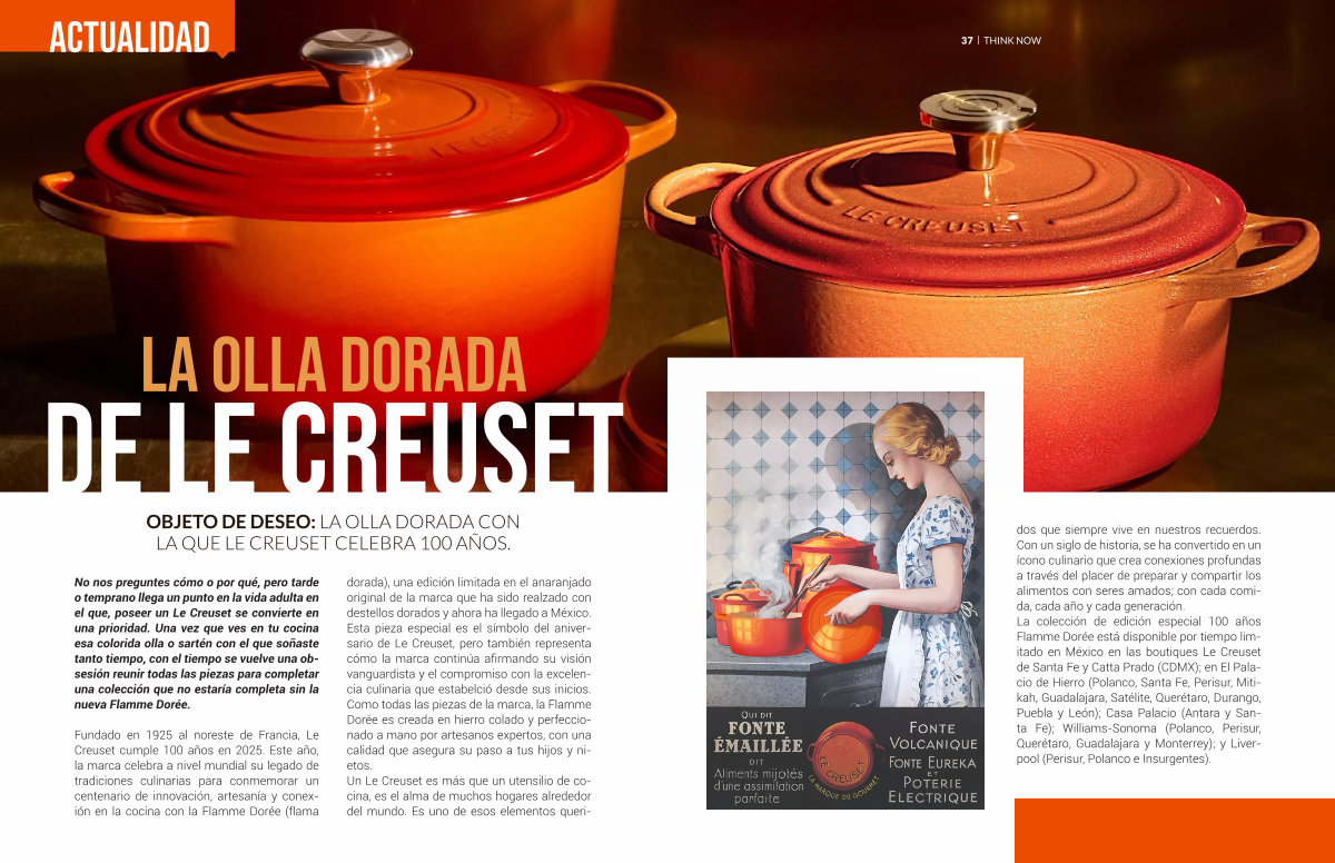 dos que siempre vive en nuestros recuerdos. Con un siglo de historia, se ha convertido en un ícono culinario que crea conexiones profundas a través del placer de preparar y compartir los alimentos con seres amados; con cada comida, cada año y cada generación. La colección de edición especial 100 años Flamme Dorée está disponible por tiempo limitado en México en las boutiques Le Creuset de Santa Fe y Catta Prado( CDMX); en El Palacio de Hierro( Polanco, Santa Fe, Perisur, Mitikah, Guadalajara, Satélite, Querétaro, Durango, Puebla y León); Casa Palacio( Antara y Santa Fe); Williams-Sonoma( Polanco, Perisur, Querétaro, Guadalajara y Monterrey); y Liverpool( Perisur, Polanco e Insurgentes).