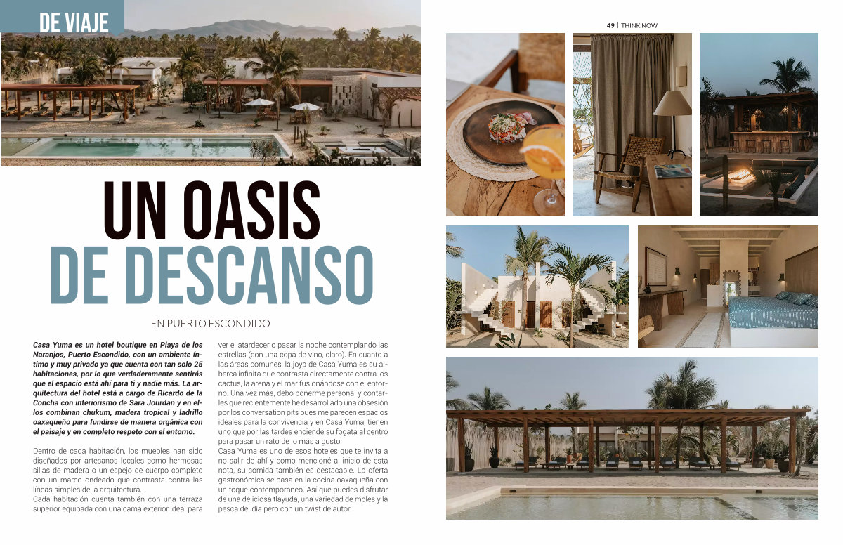 Dentro de cada habitación, los muebles han sido diseñados por artesanos locales como hermosas sillas de madera o un espejo de cuerpo completo con un marco ondeado que contrasta contra las líneas simples de la arquitectura. Cada habitación cuenta también con una terraza superior equipada con una cama exterior ideal para ver el atardecer o pasar la noche contemplando las estrellas( con una copa de vino, claro). En cuanto a las áreas comunes, la joya de Casa Yuma es su alberca infinita que contrasta directamente contra los cactus, la arena y el mar fusionándose con el entorno. Una vez más, debo ponerme personal y contarles que recientemente he desarrollado una obsesión por los conversation pits pues me parecen espacios ideales para la convivencia y en Casa Yuma, tienen uno que por las tardes enciende su fogata al centro para pasar un rato de lo más a gusto. Casa Yuma es uno de esos hoteles que te invita a no salir de ahí y como mencioné al inicio de esta nota, su comida también es destacable. La oferta gastronómica se basa en la cocina oaxaqueña con un toque contemporáneo. Así que puedes disfrutar de una deliciosa tlayuda, una variedad de moles y la pesca del día pero con un twist de autor.