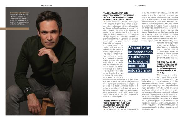 TK : ¿ CUÉNTANOS DE TU PARTICIPACIÓN EN LA OBRA “ NETWORK ” Y QUÉ ES LO QUE MÁS DISFRUTAS DE HACER TEATRO ? FR : Interpreto a un codicioso y visceral director ejecutivo que quiere transformar la división de noticias de la cadena UBS . “ Frank Hackett es un hombre inteligente , ambicioso , visceral y rabioso , de principios muy básicos y baja moral . Representa una nueva generación dentro del mundo corporativo que busca subir el rating del noticiero que quiere sacar provecho económico a costa de lo que sea ”, es un personaje muy divertido y que de igual forma me ha dejado muchas satisfacciones . Lo que más disfruto de hacer teatro es el “ hecho vivo ”, el que no hay toma dos , el poder formar un equipo con los demás actores ., el que suceda , el tener la respuesta de la gente inmediata , para mí eso es espectacular , te obliga a estar y a vivir el “ aquí y el ahora ”.