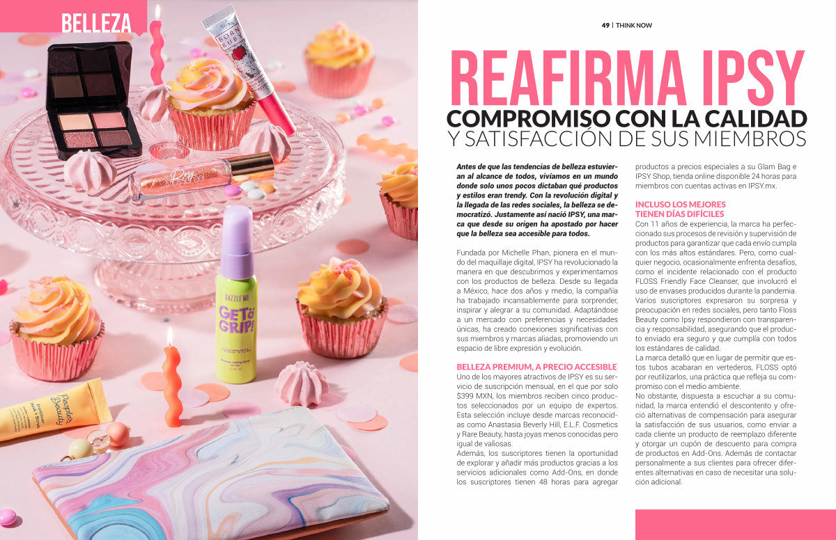 BELLEZA PREMIUM, A PRECIO ACCESIBLE Uno de los mayores atractivos de IPSY es su servicio de suscripción mensual, en el que por solo $ 399 MXN, los miembros reciben cinco productos seleccionados por un equipo de expertos. Esta selección incluye desde marcas reconocidas como Anastasia Beverly Hill, E. L. F. Cosmetics y Rare Beauty, hasta joyas menos conocidas pero igual de valiosas. Además, los suscriptores tienen la oportunidad de explorar y añadir más productos gracias a los servicios adicionales como Add-Ons, en donde los suscriptores tienen 48 horas para agregar productos a precios especiales a su Glam Bag e IPSY Shop, tienda online disponible 24 horas para miembros con cuentas activas en IPSY. mx.