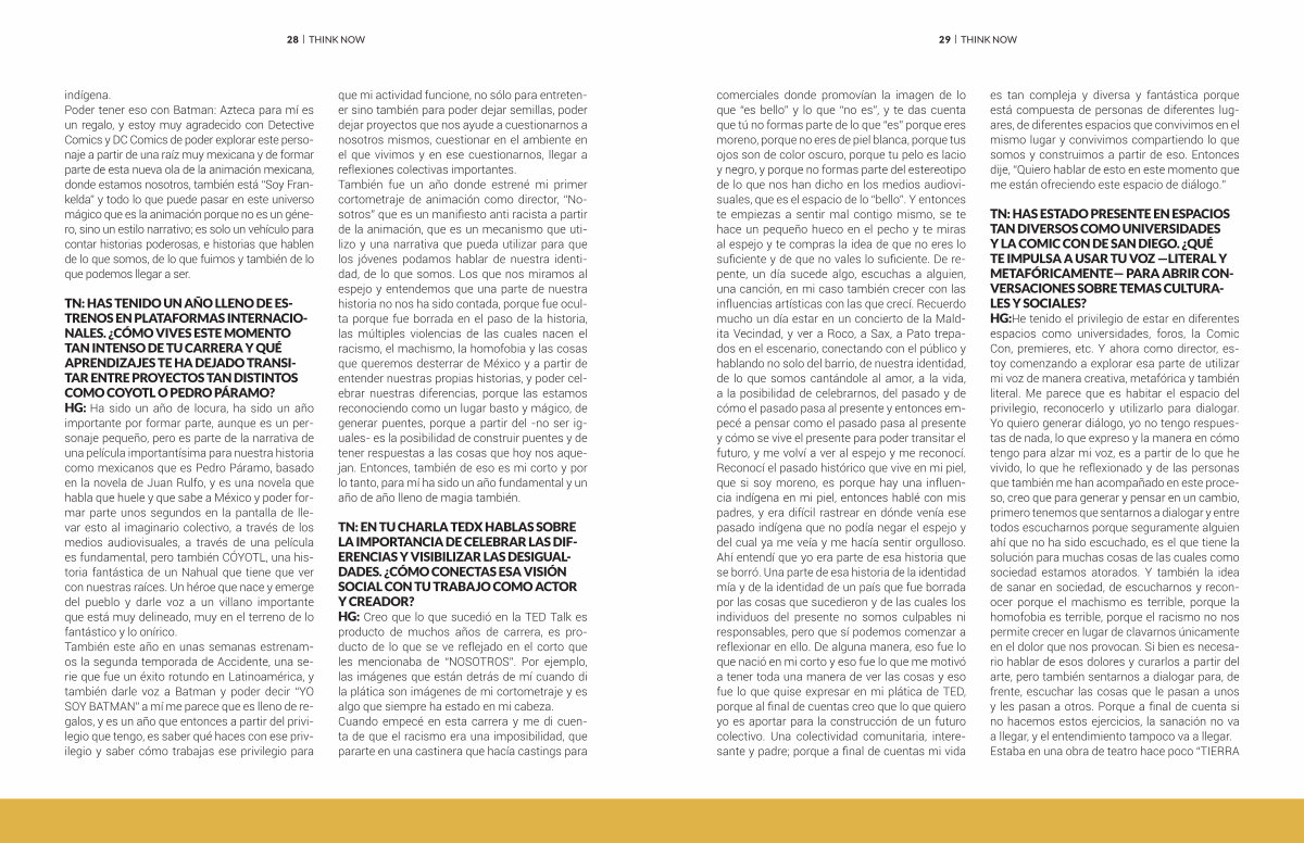 TN: HAS TENIDO UN AÑO LLENO DE ES- TRENOS EN PLATAFORMAS INTERNACIO- NALES. ¿ CÓMO VIVES ESTE MOMENTO TAN INTENSO DE TU CARRERA Y QUÉ APRENDIZAJES TE HA DEJADO TRANSI- TAR ENTRE PROYECTOS TAN DISTINTOS COMO COYOTL O PEDRO PÁRAMO? HG: Ha sido un año de locura, ha sido un año importante por formar parte, aunque es un personaje pequeño, pero es parte de la narrativa de una película importantísima para nuestra historia como mexicanos que es Pedro Páramo, basado en la novela de Juan Rulfo, y es una novela que habla que huele y que sabe a México y poder formar parte unos segundos en la pantalla de llevar esto al imaginario colectivo, a través de los medios audiovisuales, a través de una película es fundamental, pero también CÓYOTL, una historia fantástica de un Nahual que tiene que ver con nuestras raíces. Un héroe que nace y emerge del pueblo y darle voz a un villano importante que está muy delineado, muy en el terreno de lo fantástico y lo onírico. También este año en unas semanas estrenamos la segunda temporada de Accidente, una serie que fue un éxito rotundo en Latinoamérica, y también darle voz a Batman y poder decir“ YO SOY BATMAN” a mí me parece que es lleno de regalos, y es un año que entonces a partir del privilegio que tengo, es saber qué haces con ese privilegio y saber cómo trabajas ese privilegio para que mi actividad funcione, no sólo para entretener sino también para poder dejar semillas, poder dejar proyectos que nos ayude a cuestionarnos a nosotros mismos, cuestionar en el ambiente en el que vivimos y en ese cuestionarnos, llegar a reflexiones colectivas importantes. También fue un año donde estrené mi primer cortometraje de animación como director,“ Nosotros” que es un manifiesto anti racista a partir de la animación, que es un mecanismo que utilizo y una narrativa que pueda utilizar para que los jóvenes podamos hablar de nuestra identidad, de lo que somos. Los que nos miramos al espejo y entendemos que una parte de nuestra historia no nos ha sido contada, porque fue oculta porque fue borrada en el paso de la historia, las múltiples violencias de las cuales nacen el racismo, el machismo, la homofobia y las cosas que queremos desterrar de México y a partir de entender nuestras propias historias, y poder celebrar nuestras diferencias, porque las estamos reconociendo como un lugar basto y mágico, de generar puentes, porque a partir del-no ser iguales- es la posibilidad de construir puentes y de tener respuestas a las cosas que hoy nos aquejan. Entonces, también de eso es mi corto y por lo tanto, para mí ha sido un año fundamental y un año de año lleno de magia también.