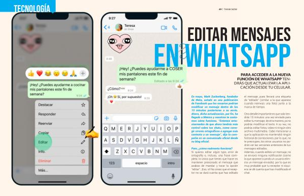 En mayo , Mark Zuckerberg , fundador de Meta , señaló en una publicación de Facebook que los usuarios podrían modificar un mensaje dentro de los 15 minutos posteriores a su envío . Ahora , dicha actualización , por fin , ha llegado a México y nosotros te contamos cómo funciona . “ Estamos entusiasmados de que ahora tendrás más control sobre tus chats , como corregir errores ortográficos o agregar más contexto a un mensaje ”, dijo la compañía en un comunicado oficial desde su blog oficial .