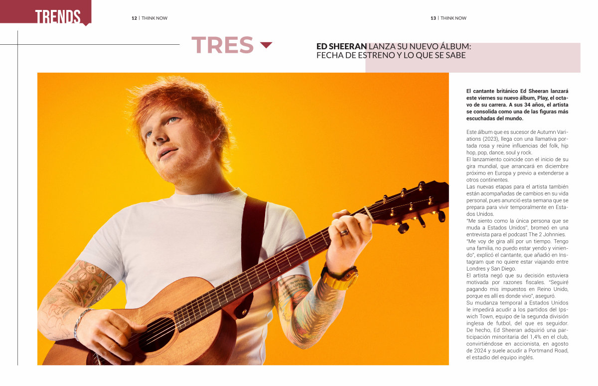 Este álbum que es sucesor de Autumn Variations( 2023), llega con una llamativa portada rosa y reúne influencias del folk, hip hop, pop, dance, soul y rock. El lanzamiento coincide con el inicio de su gira mundial, que arrancará en diciembre próximo en Europa y previo a extenderse a otros continentes. Las nuevas etapas para el artista también están acompañadas de cambios en su vida personal, pues anunció esta semana que se prepara para vivir temporalmente en Estados Unidos.“ Me siento como la única persona que se muda a Estados Unidos”, bromeó en una entrevista para el podcast The 2 Johnnies.“ Me voy de gira allí por un tiempo. Tengo una familia, no puedo estar yendo y viniendo”, explicó el cantante, que añadió en Instagram que no quiere estar viajando entre Londres y San Diego. El artista negó que su decisión estuviera motivada por razones fiscales.“ Seguiré pagando mis impuestos en Reino Unido, porque es allí es donde vivo”, aseguró. Su mudanza temporal a Estados Unidos le impedirá acudir a los partidos del Ipswich Town, equipo de la segunda división inglesa de futbol, del que es seguidor. De hecho, Ed Sheeran adquirió una participación minoritaria del 1,4 % en el club, convirtiéndose en accionista, en agosto de 2024 y suele acudir a Portmand Road, el estadio del equipo inglés.