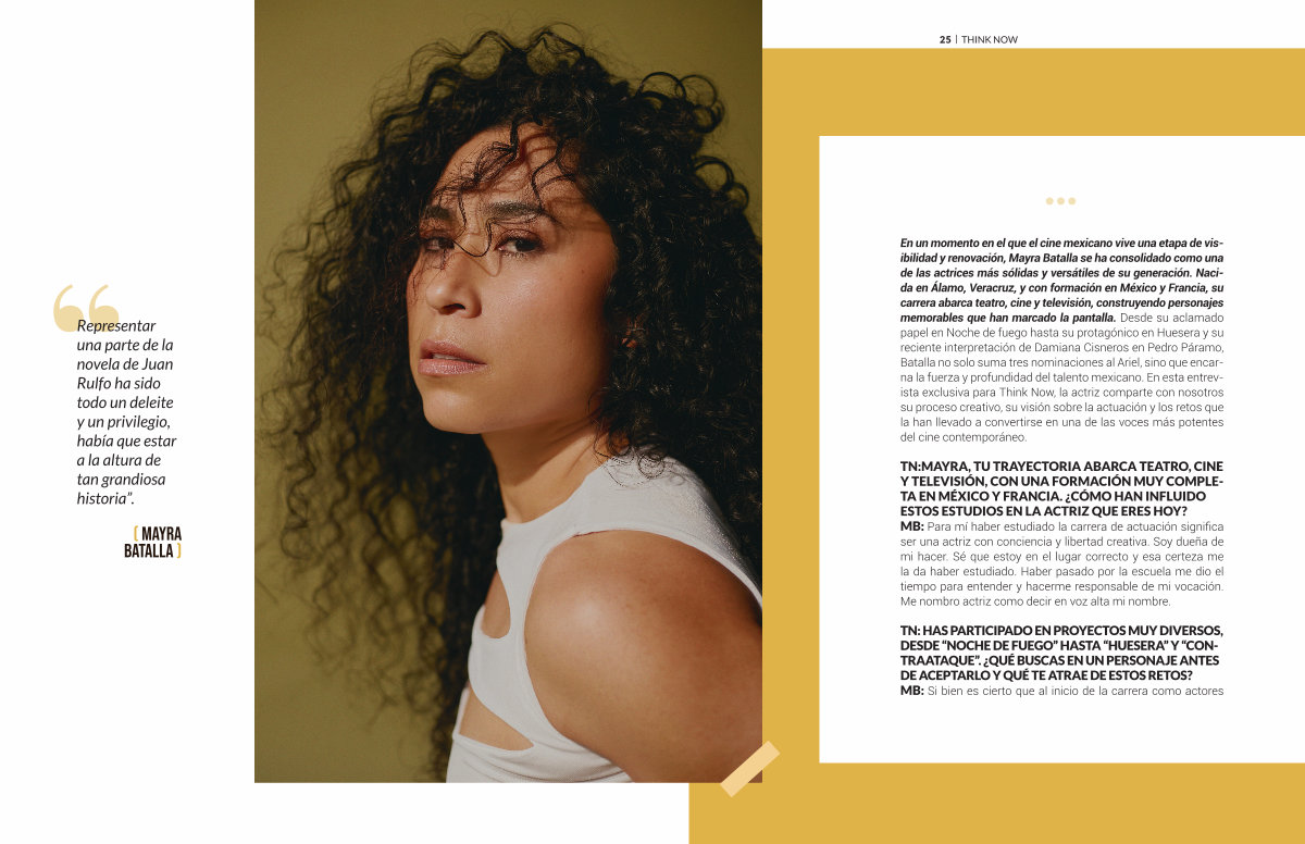 En un momento en el que el cine mexicano vive una etapa de visibilidad y renovación, Mayra Batalla se ha consolidado como una de las actrices más sólidas y versátiles de su generación. Nacida en Álamo, Veracruz, y con formación en México y Francia, su carrera abarca teatro, cine y televisión, construyendo personajes memorables que han marcado la pantalla. Desde su aclamado papel en Noche de fuego hasta su protagónico en Huesera y su reciente interpretación de Damiana Cisneros en Pedro Páramo, Batalla no solo suma tres nominaciones al Ariel, sino que encarna la fuerza y profundidad del talento mexicano. En esta entrevista exclusiva para Think Now, la actriz comparte con nosotros su proceso creativo, su visión sobre la actuación y los retos que la han llevado a convertirse en una de las voces más potentes del cine contemporáneo.