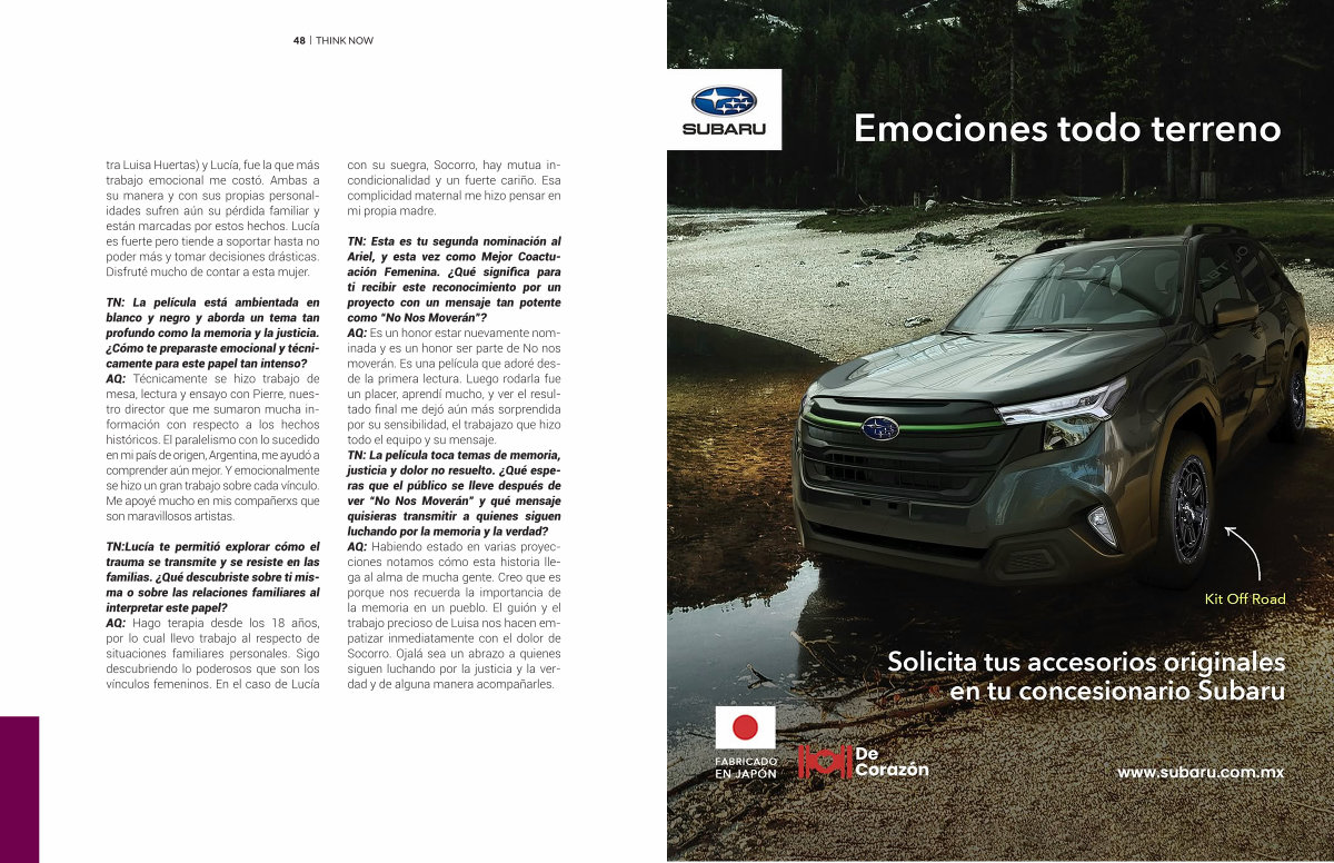 TN: Esta es tu segunda nominación al Ariel, y esta vez como Mejor Coactuación Femenina. ¿ Qué significa para ti recibir este reconocimiento por un proyecto con un mensaje tan potente como“ No Nos Moverán”? AQ: Es un honor estar nuevamente nominada y es un honor ser parte de No nos moverán. Es una película que adoré desde la primera lectura. Luego rodarla fue un placer, aprendí mucho, y ver el resultado final me dejó aún más sorprendida por su sensibilidad, el trabajazo que hizo todo el equipo y su mensaje. TN: La película toca temas de memoria, justicia y dolor no resuelto. ¿ Qué esperas que el público se lleve después de ver“ No Nos Moverán” y qué mensaje quisieras transmitir a quienes siguen luchando por la memoria y la verdad? AQ: Habiendo estado en varias proyecciones notamos cómo esta historia llega al alma de mucha gente. Creo que es porque nos recuerda la importancia de la memoria en un pueblo. El guión y el trabajo precioso de Luisa nos hacen empatizar inmediatamente con el dolor de Socorro. Ojalá sea un abrazo a quienes siguen luchando por la justicia y la verdad y de alguna manera acompañarles.