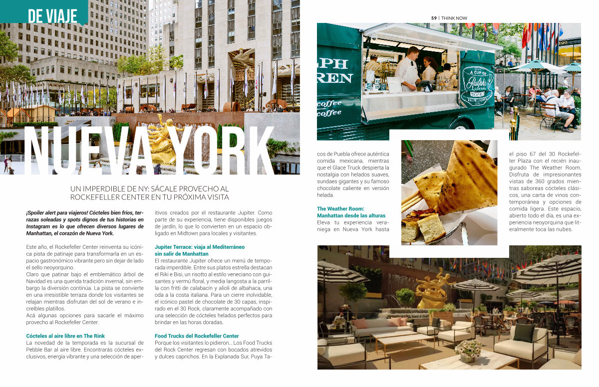The Weather Room: Manhattan desde las alturas Eleva tu experiencia veraniega en Nueva York hasta el piso 67 del 30 Rockefeller Plaza con el recién inaugurado The Weather Room. Disfruta de impresionantes vistas de 360 grados mientras saboreas cócteles clásicos, una carta de vinos contemporánea y opciones de comida ligera. Este espacio, abierto todo el día, es una experiencia neoyorquina que literalmente toca las nubes.