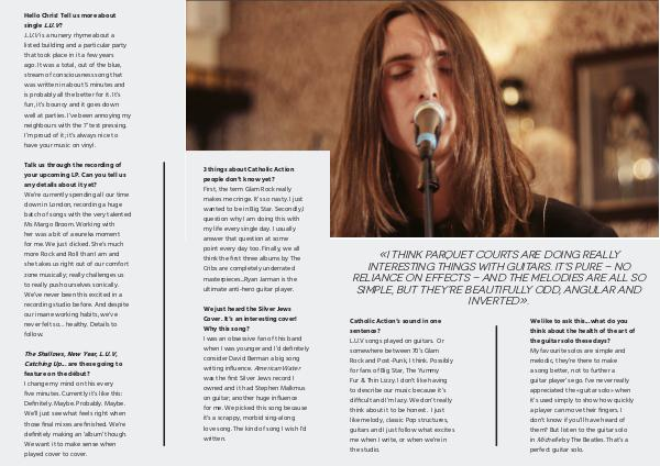 Catholic Action’ s sound in one sentence? L. U. V songs played on guitars. Or somewhere between 70’ s Glam Rock and Post-Punk, I think. Possibly for fans of Big Star, The Yummy Fur & Thin Lizzy. I don’ t like having to describe our music because it’ s difficult and I’ m lazy. We don’ t really think about it to be honest. I just like melody, classic Pop structures, guitars and I just follow what excites me when I write, or when we’ re in the studio.