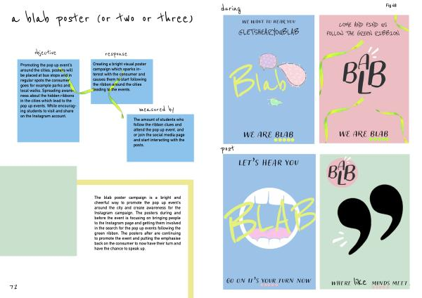 The blab poster campaign is a bright and cheerful way to promote the pop up event ’ s around the city and create awareness for the Instagram campaign . The posters during and before the event is focusing on bringing people to the Instagram page and getting them involved in the search for the pop up events following the green ribbon . The posters after are continuing to promote the event and putting the emphasise back on the consumer to now have their turn and have the chance to speak up .