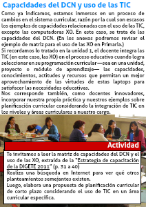 Como ya indicamos, estamos inmersos en un proceso de cambios en el sistema curricular, razón por la cual son escasos los ejemplos de capacidades relacionadas con el uso de las TIC, excepto las computadoras XO. En este caso, se trata de las capacidades del DCN. (En los anexos podremos revisar el ejemplo de matriz para el uso de las XO en Primaria.)