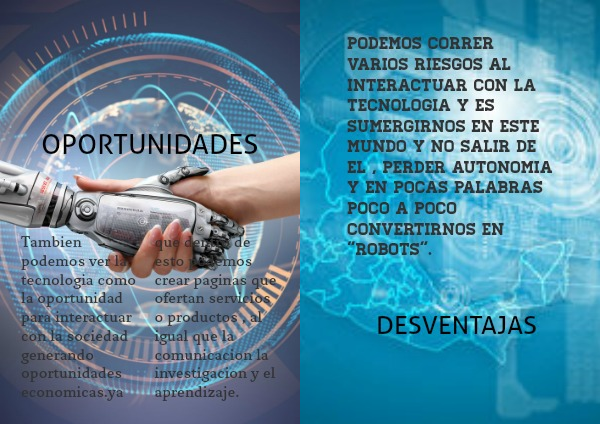 podemos correr varios riesgos al interactuar con la tecnologia y es sumergirnos en este mundo y no salir de el , perder autonomia y en pocas palabras poco a poco convertirnos en "robots".