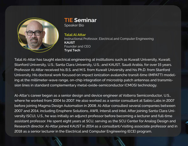 Talal Al-Attar has taught electrical engineering at institutions such as Kuwait University, Kuwait; Stanford University, U. S.; Santa Clara University, U. S.; and KAUST, Saudi Arabia, for over 15 years.