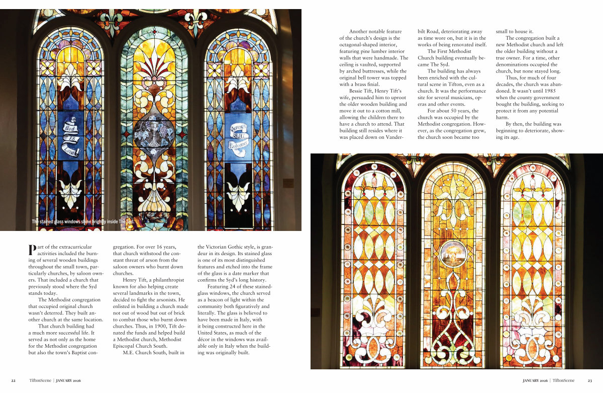 M. E. Church South, built in the Victorian Gothic style, is grandeur in its design. Its stained glass is one of its most distinguished features and etched into the frame of the glass is a date marker that confirms the Syd’ s long history.
