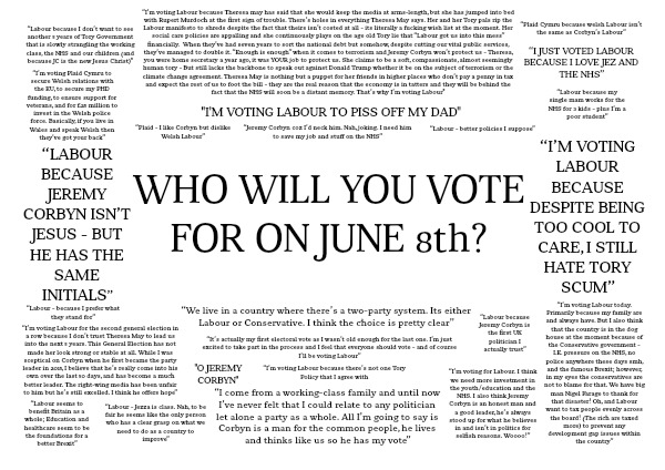 “I’m voting for Labour. I think we need more investment in the youth/education and the NHS. I also think Jeremy Corbyn is an honest man and a good leader, he’s always stood up for what he believes in and isn’t in politics for selfish reasons. Woooo!”