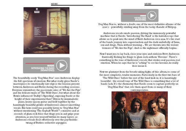 The beautifully seedy ‘Dog Man Star’ sees Anderson display the full spectrum of emotion; But what really gives Suede’s masterpiece its emotionally raw edge is the tension present between Anderson and Butler during the recording sessions. Everyone remembers the passionate cries of ‘We Are the Pigs’ and the delicate wails of ‘The Wild Ones’, but what about the Bowie influenced ‘Daddy’s Speeding’, exposing Suede at the height of their experimental flare? Driven by minimalistic piano, heavy spacey guitar and held together by the hauntingly beautiful growls of Anderson's almost unsettling vocals. But how could you possibly listen to ‘Dog Man Star’ without mentioning ‘The Asphalt World’? 9 minutes and 25 seconds of glam rock bliss that drags you in and grips your attention, as you lose yourself within its many layers; as Anderson's vocals float effortlessly over the psychedelic twang of Butlers seductive arpeggios.