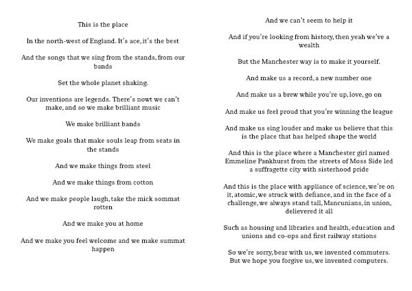 And this is the place with appliance of science, we’re on it, atomic, we struck with defiance, and in the face of a challenge, we always stand tall, Mancunians, in union, delievered it all