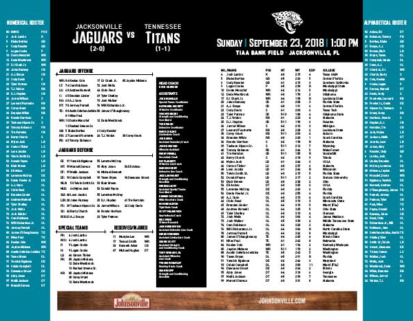 20 Jalen Ramsey CB 21 A.J. Bouye CB 22 Cody Davis S WR: 84 Keelan Cole 17 DJ Chark Jr.