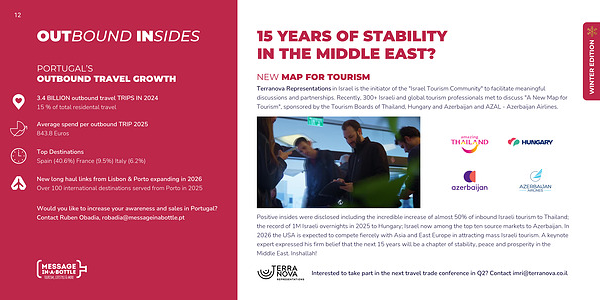 Positive insides were disclosed including the incredible increase of almost 50% of inbound Israeli tourism to Thailand; the record of 1M Israeli overnights in 2025 to Hungary; Israel now among the top ten source markets to Azerbaijan. In 2026 the USA is expected to compete fiercely with Asia and East Europe in attracting mass Israeli tourism. A keynote expert expressed his firm belief that the next 15 years will be a chapter of stability, peace and prosperity in the Middle East. Inshallah!
