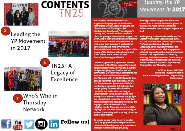 As the young professionals auxiliary of the Greater Washington Urban League 2006, 2015 & 2016 National Urban League Young Professionals National Chapter of Excellence, Thursday Network takes the charge of volunteerism, civic engagement, philanthropy, and membership development to heart. This organization is fueled by amazing, dedicated members from a variety of professions, backgrounds and interests. We are resilient in our work Empowering Communities and Changing Lives!