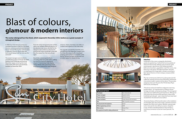 “ A standout feature of the transformation is the installation of retractable glass doors that create a seamless transition between the indoor and outdoor. Whether opened wide to let in the warmth of an African sunset or closed for a cosy, climate-controlled ambience, they maintain a continuous connection to the lush resort grounds,” he adds. www. tobuild. co. za | summer 2025-26 29