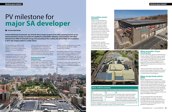 “ This is a major accomplishment,” says PC Potgieter, Head of Sustainability.“ The strategy is about more than solar installations. It’ s about building an environmentally friendly, efficient, and costeffective operational model that supports tenants and enhances shareholder value.”