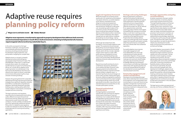 Adaptive reuse represents a transformative approach to property development that addresses both economic and environmental imperatives in South Africa ' s built environment. Unlocking its full potential will, however, require targeted reforms to drive key stakeholder buy-in.