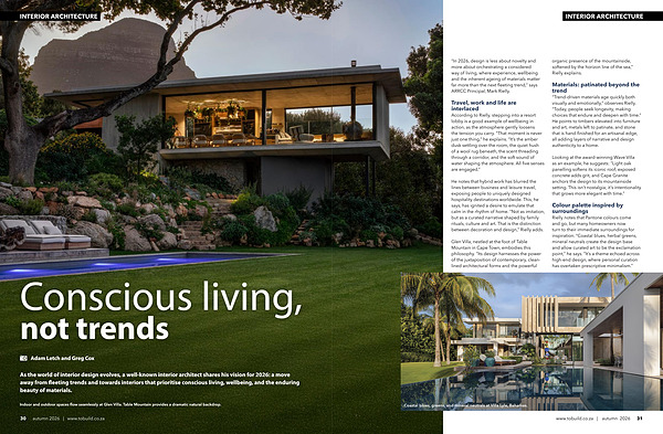 Looking at the award-winning Wave Villa as an example, he suggests:“ Light oak panelling softens its iconic roof, exposed concrete adds grit, and Cape Granite anchors the design to its mountainside setting. This isn’ t nostalgia; it’ s intentionality that grows more elegant with time.”