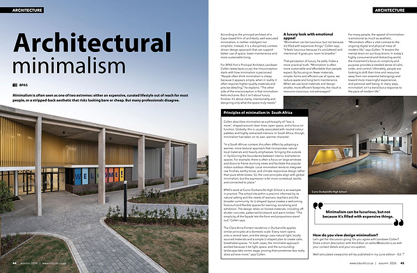 For BPAS firm ' s Principal Architect, Landseer Collen( www. bpas. co. za), the misconception starts with how minimalism is perceived.“ People often think minimalism is cheap because it appears simple, when in reality it often requires higher-quality materials and precise detailing,” he explains.“ The other side of the misconception is that minimalism feels exclusive. But it isn’ t about luxury finishes. It’ s about clarity, intentionality and designing only what the space truly needs.”