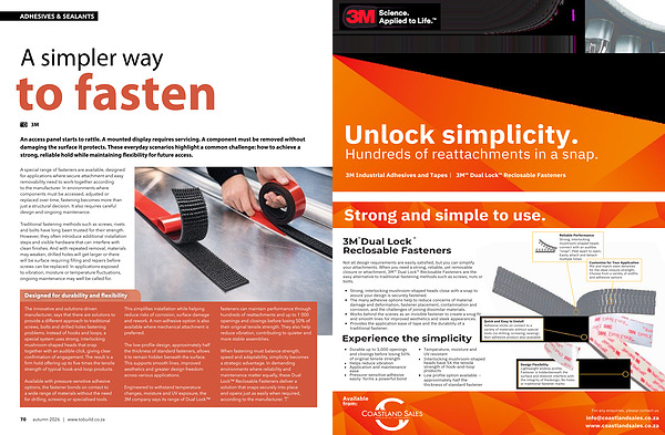 Engineered to withstand temperature changes, moisture and UV exposure, the 3M company says its range of Dual Lock™ fasteners can maintain performance through hundreds of reattachments and up to 1 000 openings and closings before losing 50 % of their original tensile strength. They also help reduce vibration, contributing to quieter and more stable assemblies.