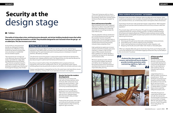“ Security barriers are no longer just crime deterrents, they are architectural assets,” opines Damian Judge, Sales and Marketing Executive at Trellidor.“ They enhance a property’ s long-term value, reduce insurance risk, and give developers a tangible way to future-proof homes against changing urban threats.”