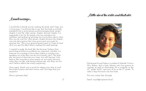 Mochamad Irsyad Dafiq is a student of Sekolah Victory Plus, Bekasi, and is from Jakarta who has passion in writing, as well as illustrating. He is currently in the 10 th grade( 2017), and soon to be in the 11 th grade. To take a Step Forward is his first book.