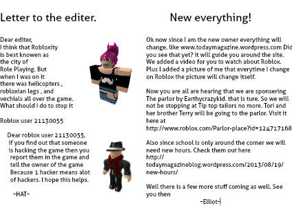 Ok now since I am the new owner everything will change. like www.todaymagazine.wordpress.com Did you see that yet? it will guide you around the site. We added a video for you to watch about Roblox. Plus I added a picture of me that everytime I change on Roblox the picture will change itself.